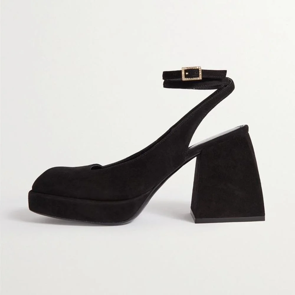 Elevate your style with these Black Vegan Suede Ankle Strap Shoes. Featuring a classic platform design and block heel, they are the perfect choice for any occasion.