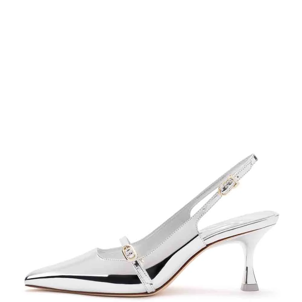 Step into sophistication with these elegant slingback pumps. Featuring a pointed toe and stylish kitten heels in a sleek silver finish, they're perfect for any occasion that calls for timeless chic.