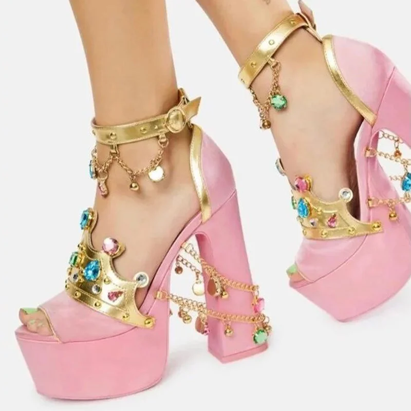 - Open toe design with decorative chains and rhinestones.